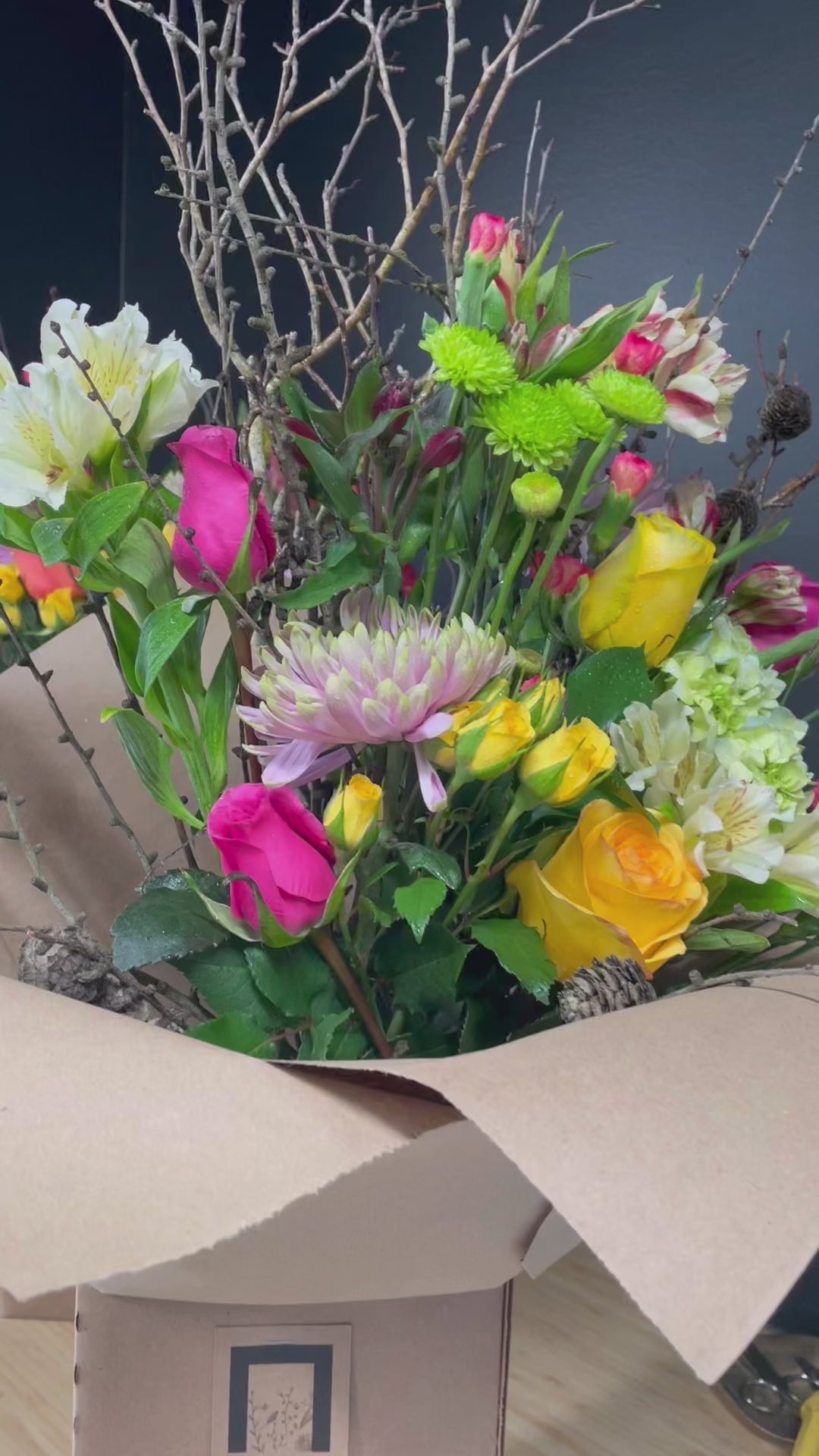 We use locally ethically foraged materials that change with the season. Every arrangement is unique. All of our arrangements are designed in our signature style using only the best and freshest blooms available that day and will likely look quite different from the example image.